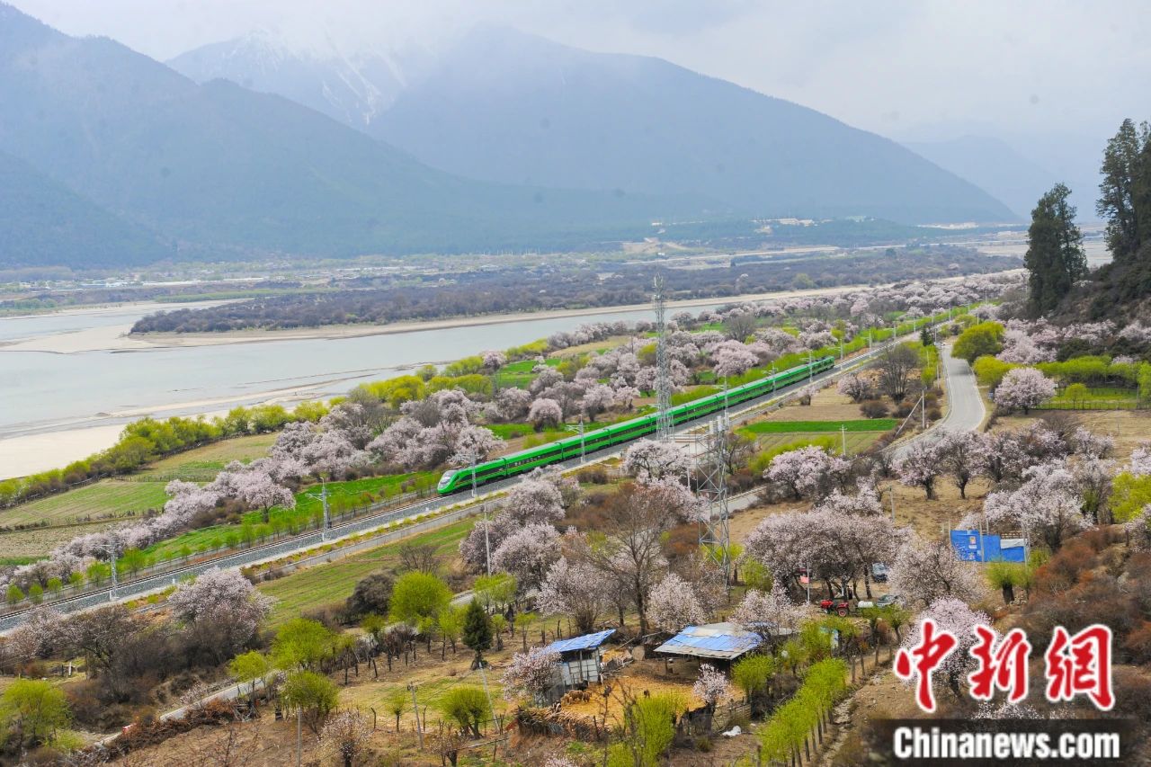 圖為穿梭在桃花林中的拉林鐵路高原復(fù)興號(hào)。 中新社記者 貢嘎來松 攝