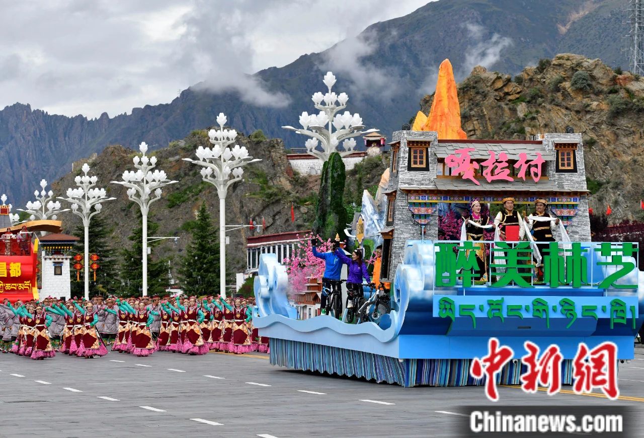 圖為西藏自治區(qū)成立60周年慶祝大會(huì)中的林芝彩車方隊(duì)。中新社記者 李林 攝