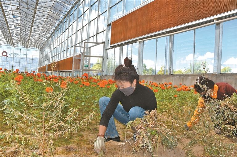 圖為在家門口實(shí)現(xiàn)就業(yè)的群眾在產(chǎn)業(yè)基地進(jìn)行田間管理。記者 丹增平措 攝