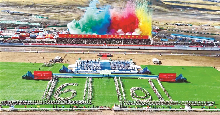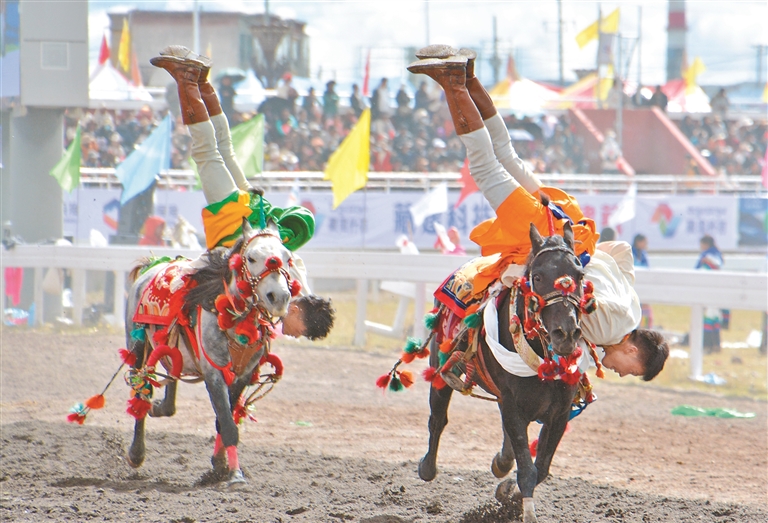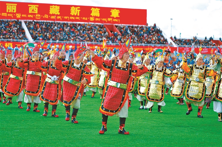 來自四川、青海及西藏本地的馬術(shù)隊英姿颯爽,躍馬揚鞭;千人共舞《禮贊甲子》,舞步豪邁,衣袂飛揚,再現(xiàn)西藏六十年的滄桑巨變;器樂合奏《風(fēng)從浙江來·樂在那曲揚》則巧妙融合江南韻律與草原風(fēng)情,奏響對口支援的深情厚誼;《馱鹽之歌》悠揚響起,仿佛將人們帶回了古老的歲月,展現(xiàn)了高原兒女堅韌不拔的精神……賽馬場核心區(qū)域,傳統(tǒng)馬術(shù)與現(xiàn)代藝術(shù)在這里交相輝映,引來掌聲如潮、喝彩不絕。
