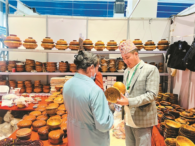 為期5天的博覽會(huì)現(xiàn)場熱鬧非凡。入口處,紅底黃字的“外貿(mào)優(yōu)品展銷”橫幅格外醒目:阿富汗商人正用不太流利的中文講解手工羊毛地毯的編織工藝;不丹展臺前,試穿傳統(tǒng)服飾的市民絡(luò)繹不絕;泰國膏藥展位的工作人員手持產(chǎn)品說明書,耐心地向顧客介紹使用方法;印度尼西亞展臺飄來咖啡焦香與伊朗藏紅花的辛香,幾位游客正輕嗅小瓷勺中的藏紅花;一旁的巴基斯坦玉石展臺前,觀眾正用手機(jī)拍攝玉飾的水波紋路,工作人員及時(shí)遞上放大鏡并介紹:“您看這紋路,是巴基斯坦特有的礦料形成的?!彪p語講解聲、詢價(jià)議價(jià)聲、游客贊嘆聲交織在一起,宛如一場生動(dòng)的“國際市集”。