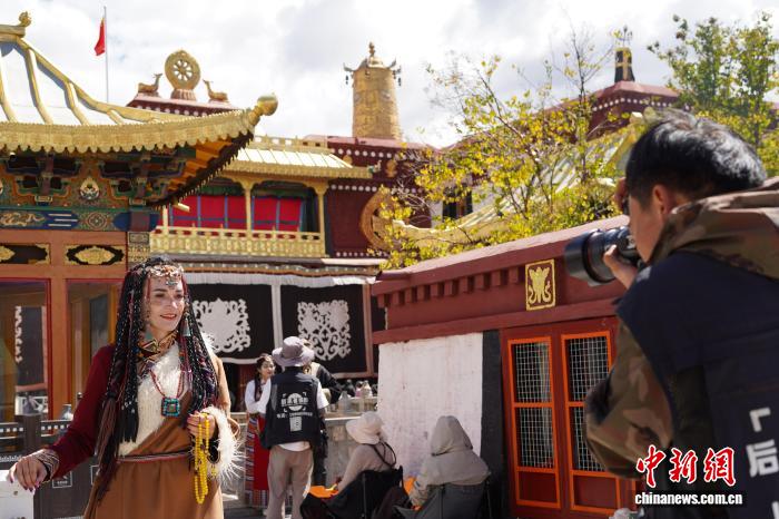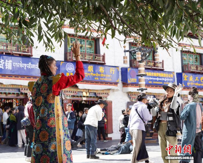 9月28日,西藏拉薩大昭寺、八廓街,來自意大利、烏克蘭、墨西哥等國的游客,身著色彩艷麗的藏族傳統(tǒng)服飾,在金頂紅墻的映襯下拍照留念。圖為來自意大利的游客身著藏裝在大昭寺廣場拍照留念。中新社記者 貢嘎來松 攝