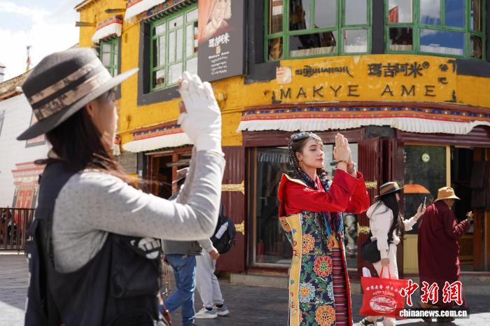 圖為來自烏克蘭的游客身著藏裝在八廓街拍照留念。中新社記者 貢嘎來松 攝