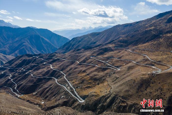 2023年1月16日,川藏公路西藏昌都段著名的“天路72拐”,該路段以高海拔、急彎、大落差等復(fù)雜驚險路況被人熟知。(無人機(jī)畫面)中新社記者 江飛波 攝