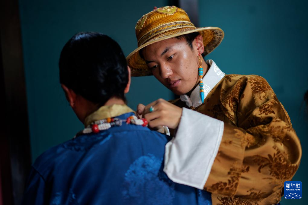 班珠丹塔(右)在穿自己設(shè)計的男士旅行服(9月9日攝)。新華社記者 晉美多吉 攝??