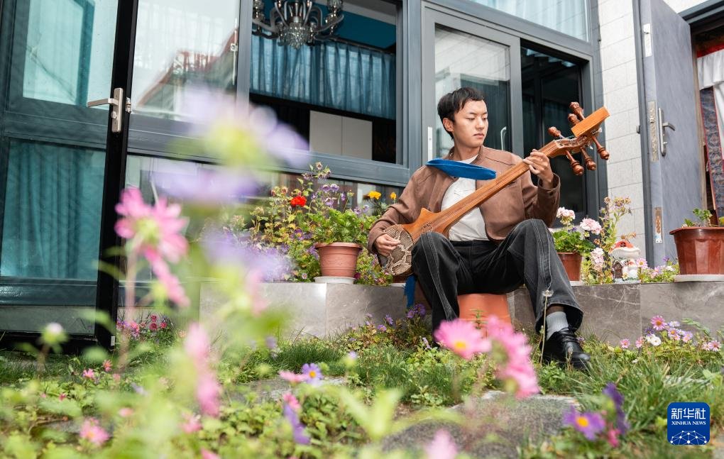 班珠丹塔在家中設(shè)計藏裝間隙彈奏扎念琴(9月11日攝)。新華社記者 丁增尼達 攝