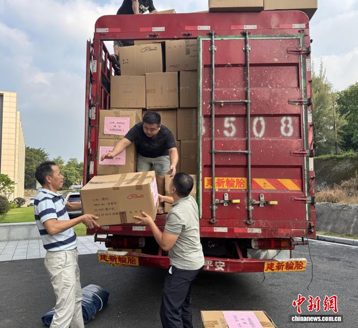 廣州市捐贈站工作人員搬運物資裝車。廣州市民政局 供圖