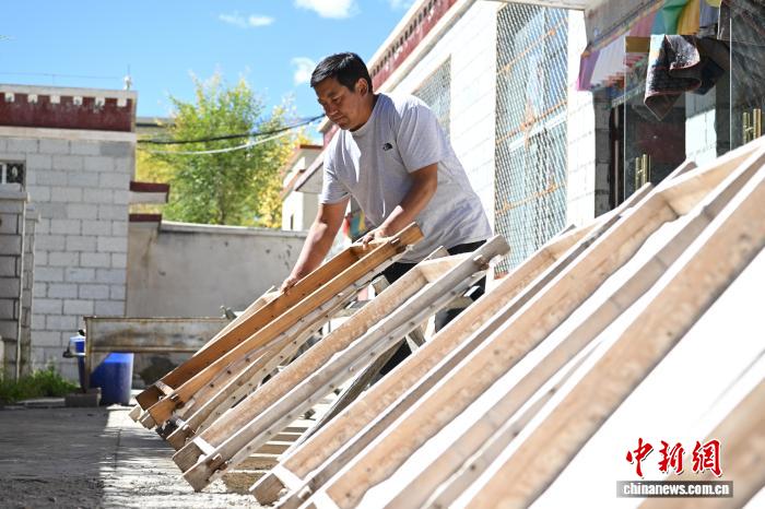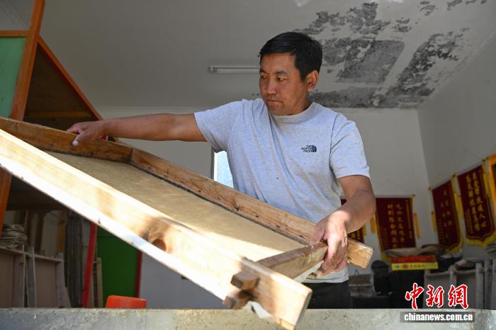 圖為尼木雪拉藏紙農(nóng)牧民專業(yè)合作社負(fù)責(zé)人格桑旦增在檢查藏紙的質(zhì)量。中新社記者 貢嘎來(lái)松 攝