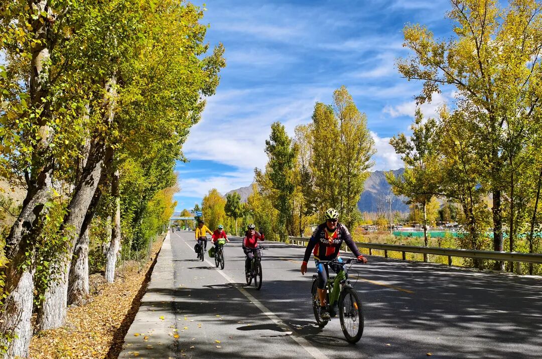 圖為自行車隊在拉薩市曲水縣秋意盎然的國道騎行。記者 次仁平措 攝