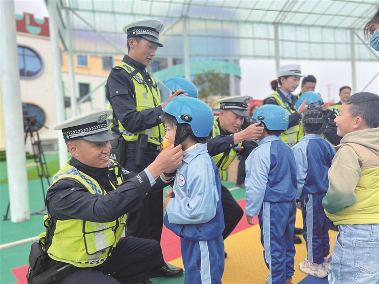 拉薩交警為孩子們示范如何佩戴安全頭盔。拉薩交警提供