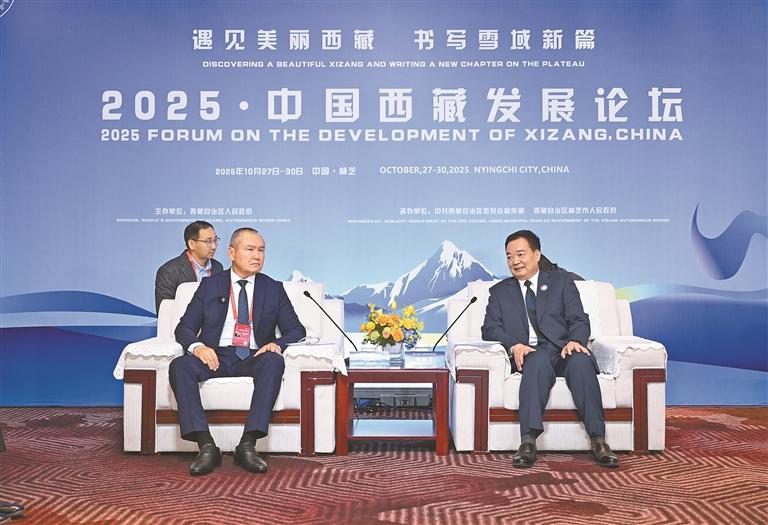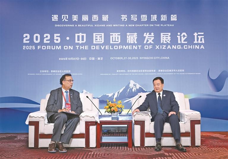 10月28日,自治區(qū)黨委書記王君正在林芝會見參加2025·中國西藏發(fā)展論壇的外國政要和駐華使節(jié)。這是王君正會見聯(lián)合國秘書長古特雷斯先生的代表,聯(lián)合國教科文組織駐華代表、東亞辦事處主任兼代表夏澤翰。本報(bào)記者 旦增西旦 攝