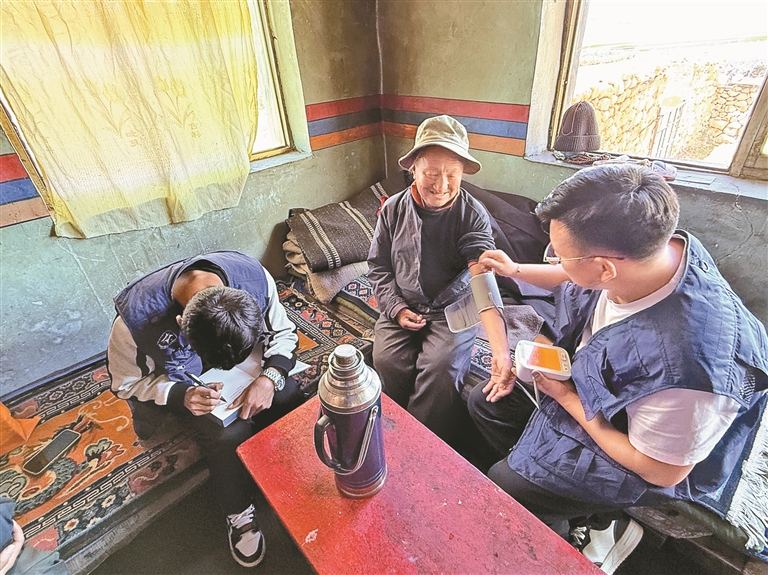 圖為當(dāng)雄縣羊八井鎮(zhèn)民政服務(wù)站工作人員入戶為特供分散戶老人做基礎(chǔ)生命體征檢查。