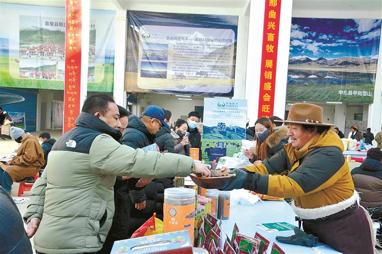 這次展銷(xiāo)會(huì)不僅線下熱鬧,線上也同樣火爆。為了讓各類(lèi)產(chǎn)品走得更遠(yuǎn),展銷(xiāo)會(huì)特意搭建起“線上直播帶貨+線下現(xiàn)場(chǎng)選購(gòu)”的雙線銷(xiāo)售通道,一邊是線下市民現(xiàn)場(chǎng)挑、現(xiàn)場(chǎng)買(mǎi),新鮮看得見(jiàn)、品質(zhì)摸得著;一邊是主播對(duì)著鏡頭,向全國(guó)網(wǎng)友推介那曲好物,讓遠(yuǎn)在千里之外的消費(fèi)者也能品嘗到那曲味道。同時(shí),展銷(xiāo)會(huì)還邀請(qǐng)電商平臺(tái)、采購(gòu)商代表和參展商精準(zhǔn)對(duì)接,幫本土農(nóng)畜產(chǎn)品打通銷(xiāo)路,再也不愁“酒香巷子深”;積極引導(dǎo)機(jī)關(guān)、企事業(yè)單位及社會(huì)各界參與消費(fèi)幫扶,以“以購(gòu)代扶”“以買(mǎi)促銷(xiāo)”的方式助力本土產(chǎn)業(yè)發(fā)展,在全市形成“人人支持本土產(chǎn)業(yè)、人人參與鄉(xiāng)村振興”的濃厚氛圍。