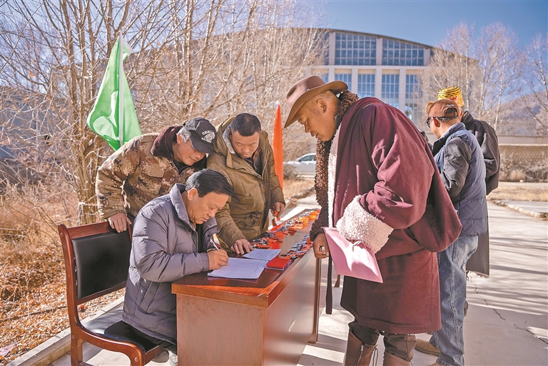 村民在領(lǐng)取新房鑰匙。記者 阿旺尼瑪 攝