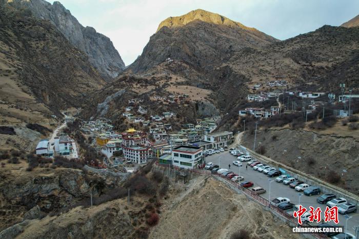 1月2日傍晚,拉薩市墨竹工卡縣德仲溫泉附近的停車場幾乎停滿了車輛。(無人機畫面)中新社記者 江飛波 攝