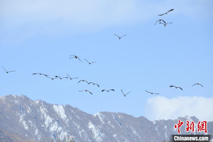 圖為拉薩林周縣黑頸鶴保護(hù)區(qū)內(nèi),黑頸鶴在雪山翱翔。貢嘎來松 攝