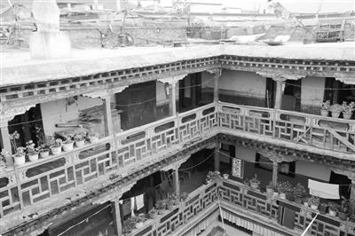 拉薩塊石碉樓四合院形成時間較早,現(xiàn)存建筑均有100多年的歷史,分布在著名的八廓古城,一般為貴族府邸和商賈宅院。由主樓和附樓圍合庭院構(gòu)成居住單元,花崗石塊石砌建筑體和木柱共同承重的石木結(jié)構(gòu)體系。“拉薩地處拉薩河谷,地勢平坦,石材資源豐富,為塊石碉樓四合院提供了先天條件?!蔽鞑毓沤▽<荫R驍利說。