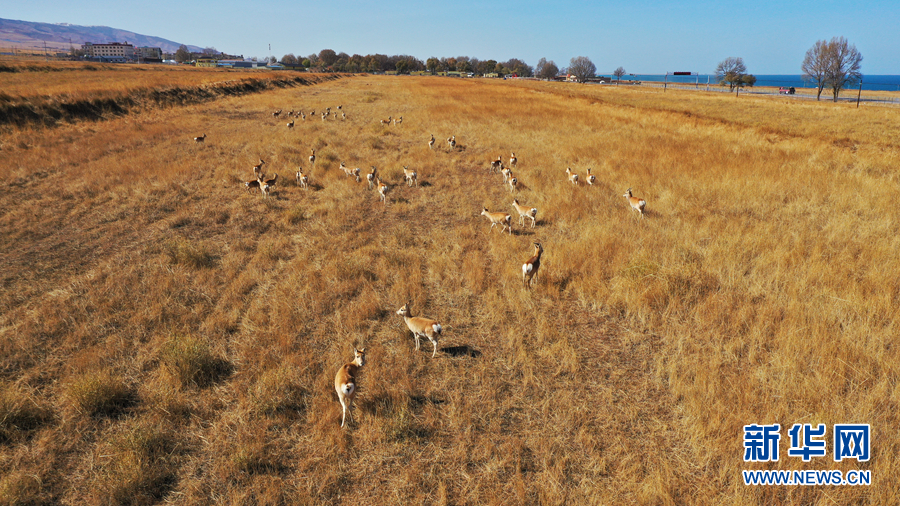 深秋時(shí)節(jié)的青海湖,芳草萋萋,遍地金黃。漫步在湖畔草原上的普氏原羚,幾乎與金黃的牧草融為一體。它們時(shí)而跳躍、時(shí)而奔走,就像湖邊一群群舞動(dòng)的精靈。