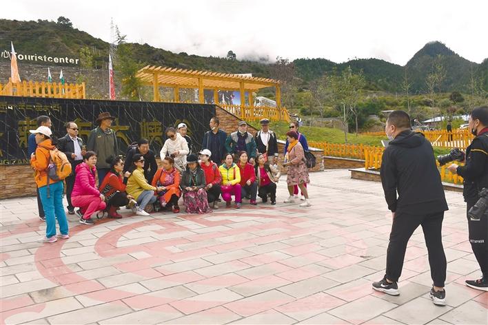 圖為來自四川的旅行團在大峽谷景區(qū)門口合影。本報記者 張猛 胡文 攝