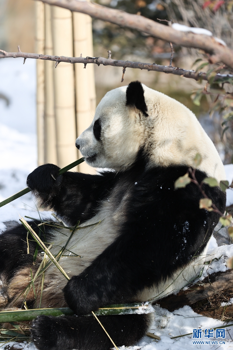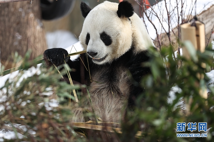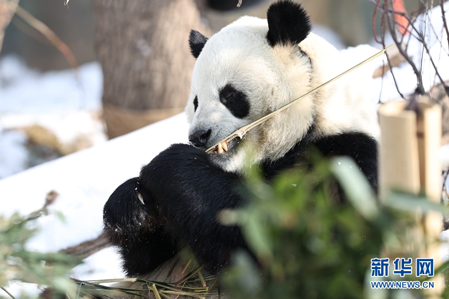 近日,受冷空氣影響,青海省西寧市迎來降雪。西寧熊貓館的四只大熊貓在雪天里享受著吃竹子、“打盹兒”的樂趣。