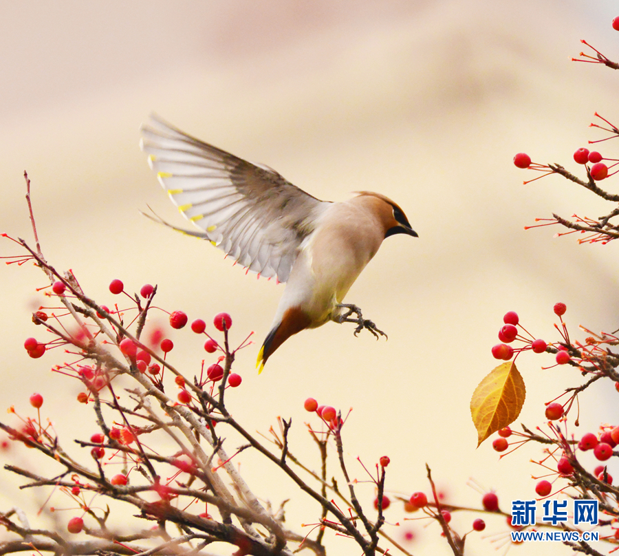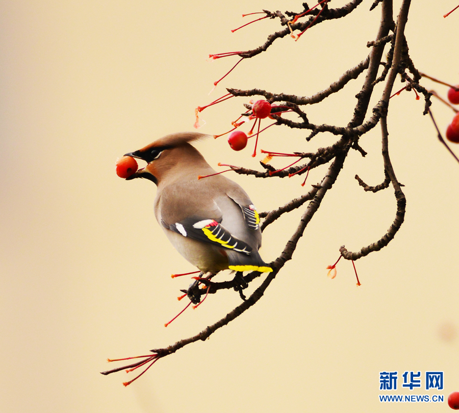 一只太平鳥正銜著一顆海棠果。新華網(wǎng)發(fā)(李崇軒攝)