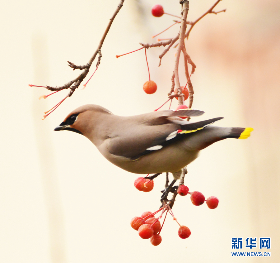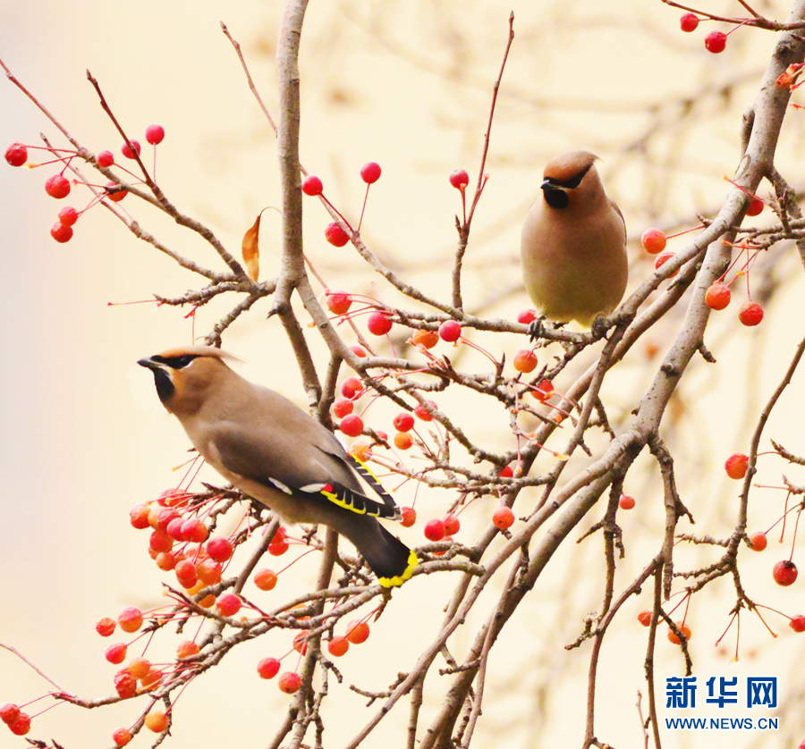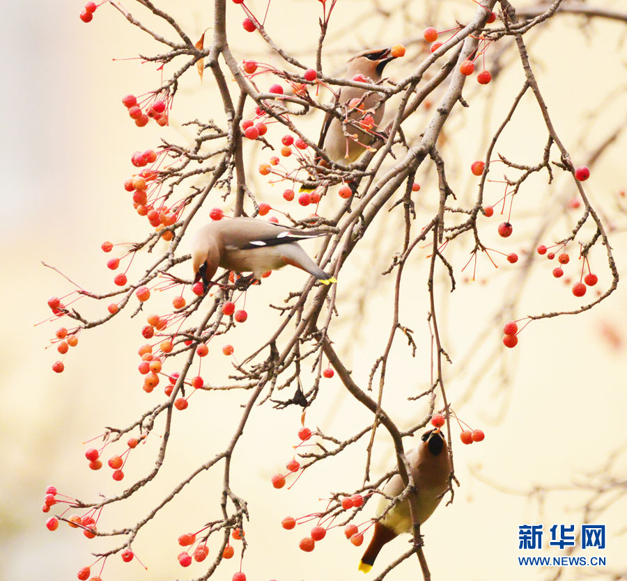 一群太平鳥正在“享用”海棠果。新華網(wǎng)發(fā)(李崇軒攝)