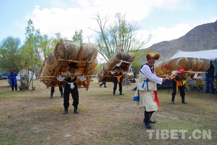 當(dāng)天恰好是周六,從拉薩來體驗(yàn)的游客不在少數(shù),有的是觀看了抖音直播就馬上騎車過來體驗(yàn)的。在營地,大家欣賞到了當(dāng)?shù)氐摹肮挝琛保ㄅFご瑁斡蛇叧吿摹鞍帷焙蜕肀撑Fご璧摹按颉焙献鞅硌??!鞍帷笔枪挝柚械念I(lǐng)舞者,跳牛皮船舞時,“阿熱”手執(zhí)“塔塔”(五彩旗桿),唱著歌,跳著舞,另外4位舞者看著“阿熱”的動作,背著重約80斤的牛皮船,用同樣的動作跟著“阿熱”跳舞。大家動作整齊,船漿擊打船舷的“咚咚”聲不絕于耳。