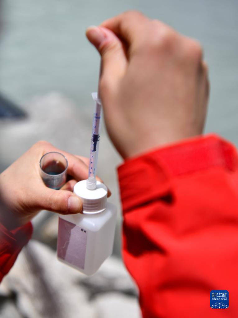 在珠峰登山大本營附近,來自中國科學院青藏高原研究所的科考隊員邱海英在檢測絨布冰川末端水質(zhì)(5月14日攝)。新華社記者 孫非 攝