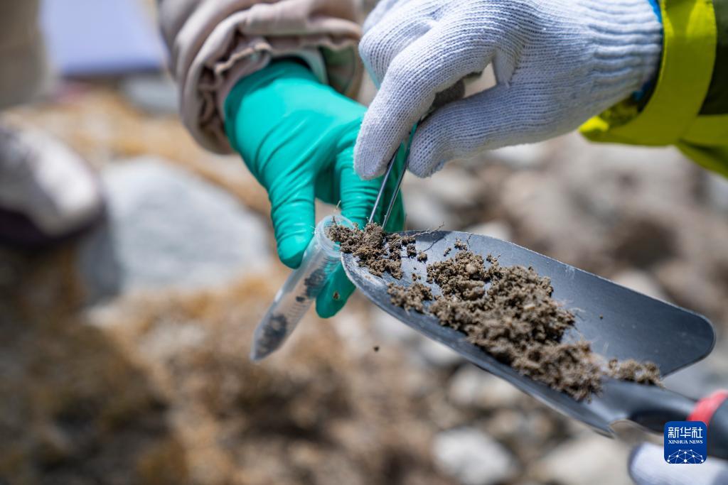 在珠峰登山大本營附近,來自西藏大學生態(tài)環(huán)境學院的科考隊員在收集土壤樣本(5月22日攝)。新華社記者 孫非 攝