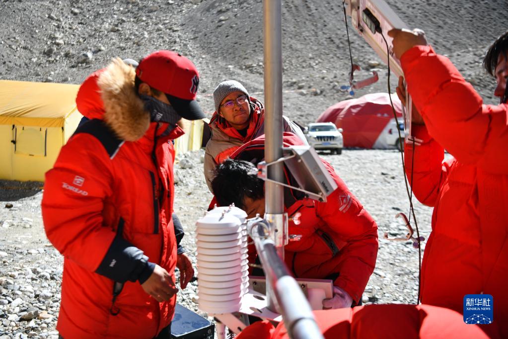 在珠峰登山大本營附近,第二次青藏科考高海拔氣象梯度觀測小組負責人趙華標(中)在指導科考登頂隊隊員架設(shè)自動氣象站(5月9日攝)。新華社記者 晉美多吉 攝