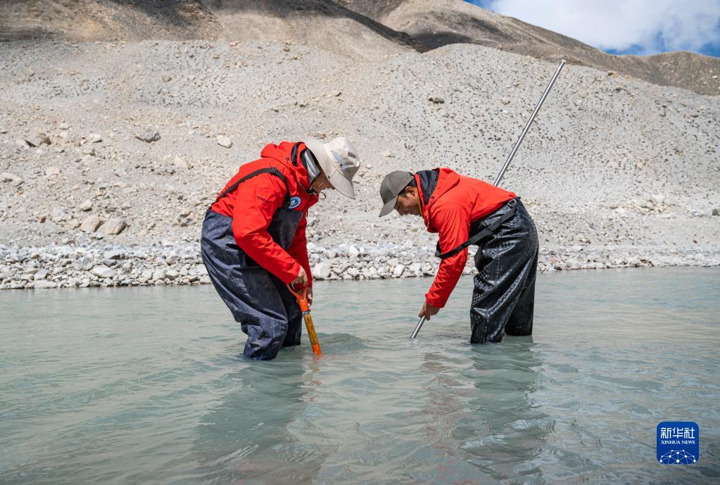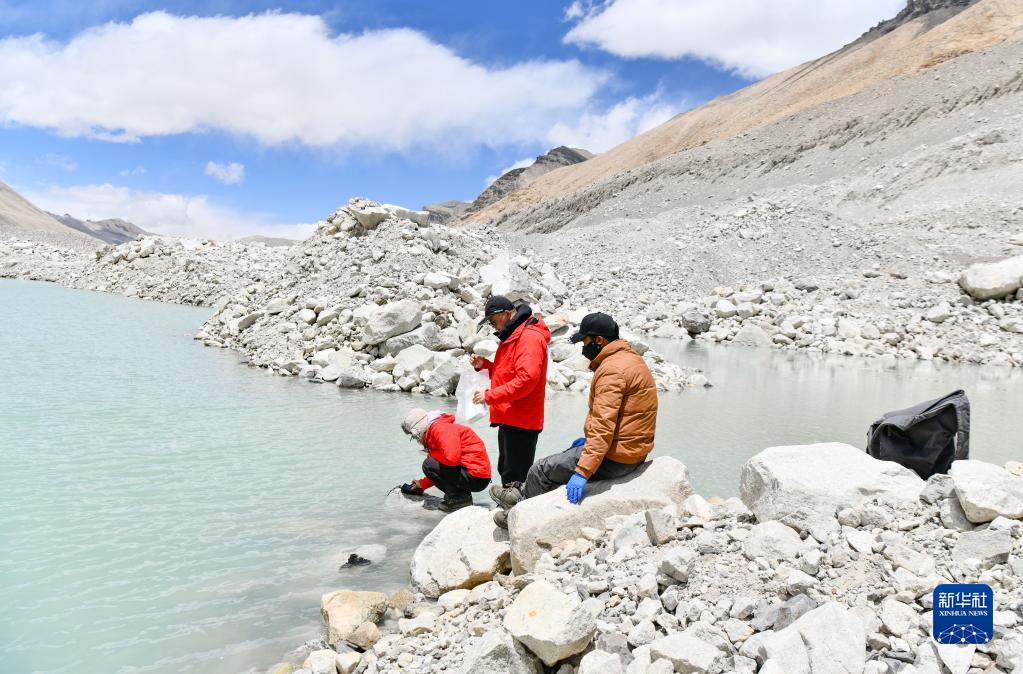 在珠峰登山大本營附近,來自西藏大學生態(tài)環(huán)境學院的科考隊員在進行水生態(tài)調(diào)查(5月22日攝)。新華社記者 孫非 攝