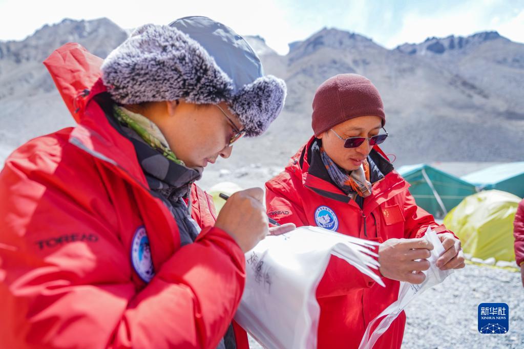 在珠峰登山大本營,中國科學院西雙版納熱帶植物園研究員蘇濤(右)和同事在樣品自封袋上做標記(5月14日攝)。新華社記者 孫非 攝