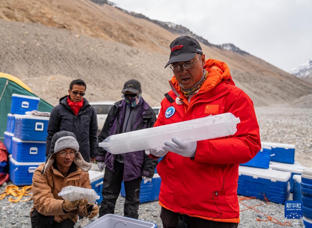 在珠峰登山大本營,中國科學院西北生態(tài)環(huán)境資源研究院副院長康世昌(右)在查看從珠峰海拔約6500米處鉆取的冰芯樣品(5月22日攝)。新華社記者 孫非 攝