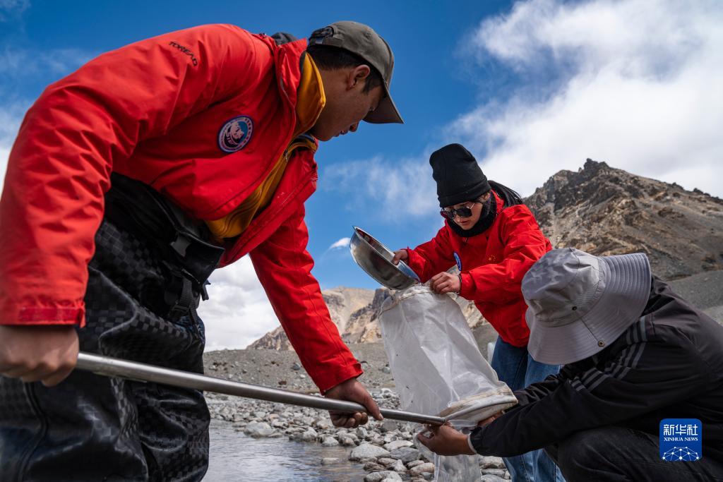 在珠峰登山大本營附近,來自西藏大學生態(tài)環(huán)境學院的科考隊員在采集水生生物樣本(5月22日攝)。新華社記者 孫非 攝