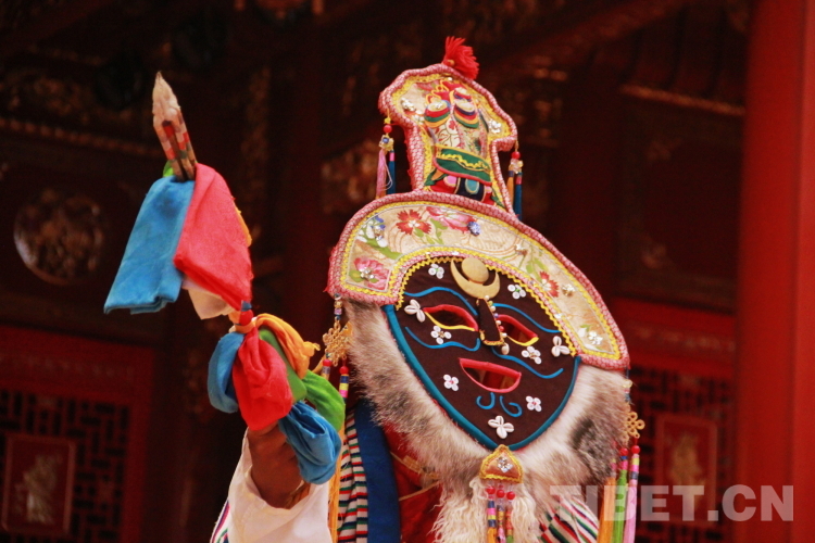 圖為拉薩市城關(guān)區(qū)娘熱民間藝術(shù)團演員多吉次仁表演國家級非物質(zhì)文化遺產(chǎn)“嘎爾”攝影:劉莉