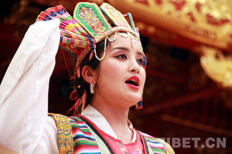 圖為拉薩市城關(guān)區(qū)娘熱民間藝術(shù)團演員洛桑卓瑪表演藏戲開場《溫巴頓》片段 攝影:劉莉