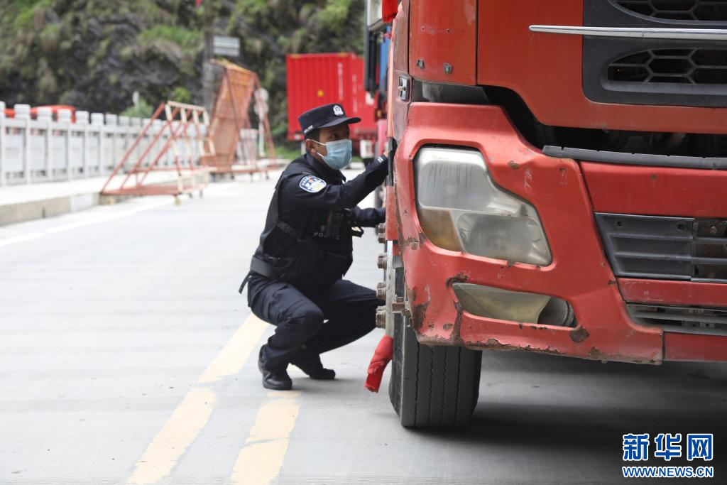 這是扎西頓珠正對(duì)入境貨車(chē)進(jìn)行車(chē)體檢查。(新華網(wǎng)發(fā) 鄒興國(guó) 攝)