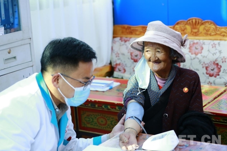 圖為亞東縣中心醫(yī)院醫(yī)護(hù)人員為老人測(cè)量血壓 圖源:帕里鎮(zhèn)四社區(qū)工作隊(duì)