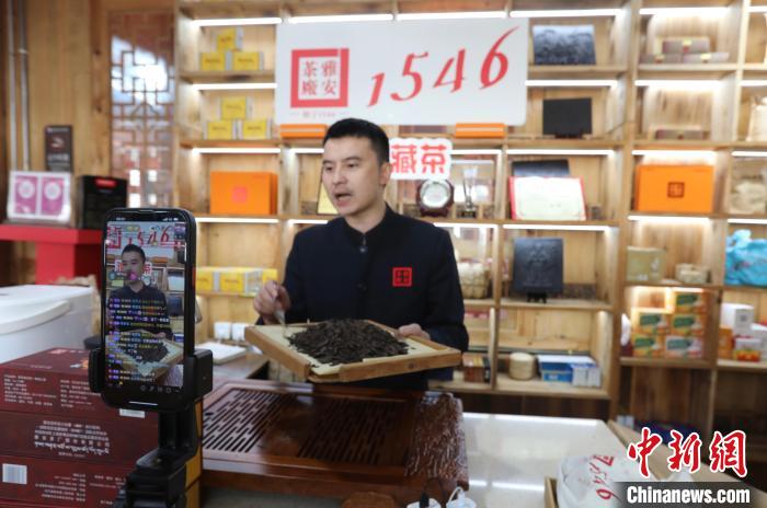 9月14日,四川省雅安茶廠內(nèi),工作人員正在直播介紹藏茶。中新網(wǎng)記者 王磊 攝