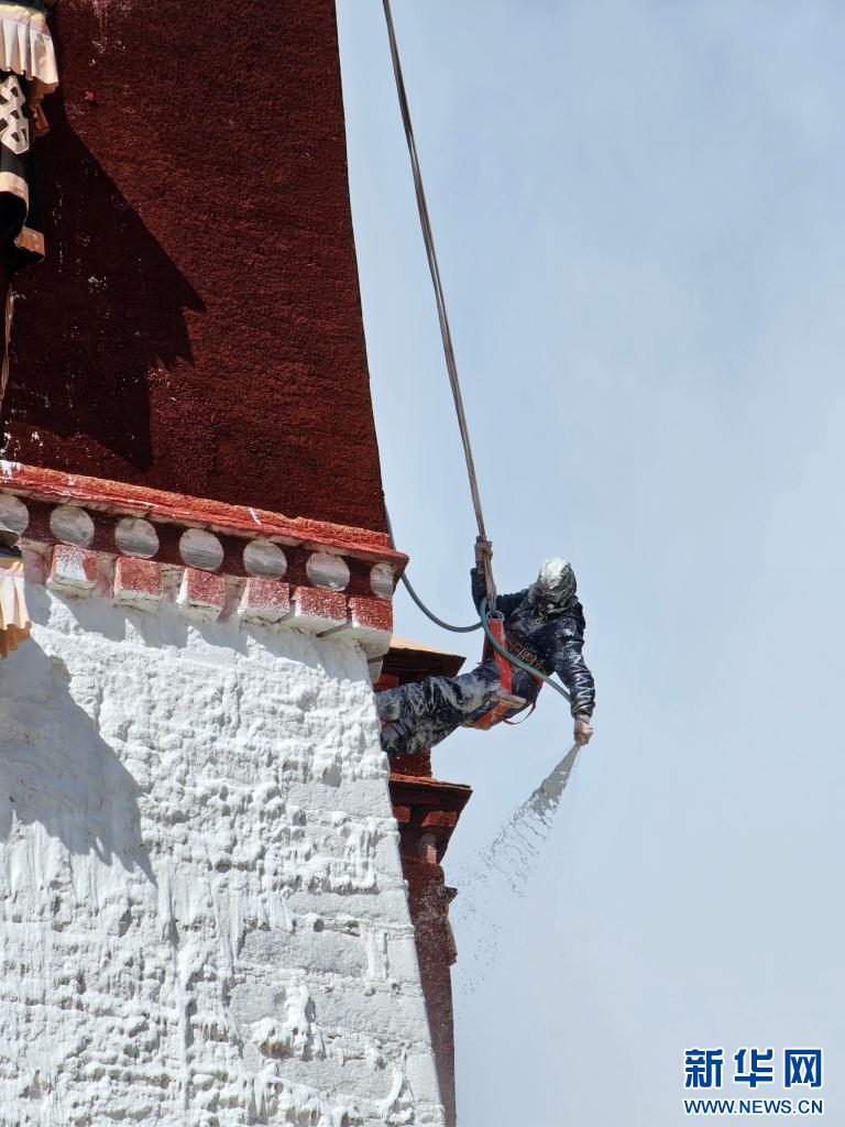 10月18日,布達(dá)拉宮“美容師”在噴灑涂料。新華網(wǎng) 柑丹鴦琦 攝 ??