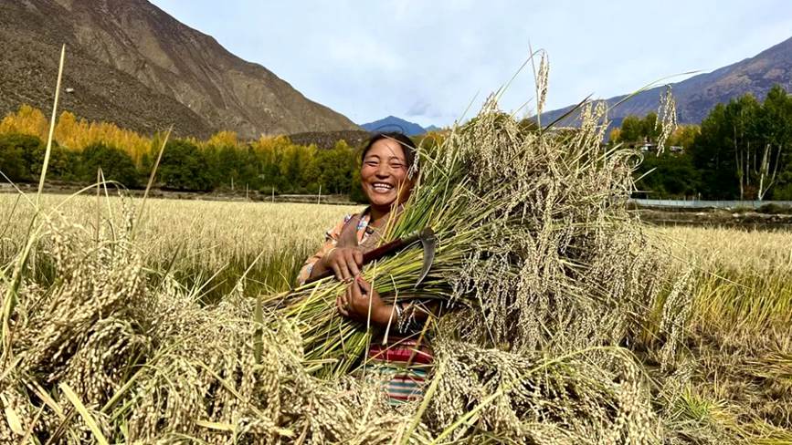 “能吃上自家種植的大米,以前這種事情想都不敢想?!必S收的喜悅洋溢在村民卓嘎臉上。她說,如今能吃上自家種的大米,非常開心,非常有成就感!