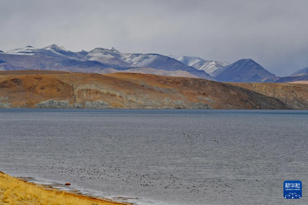 瑪旁雍錯湖面上的斑頭雁(10月29日攝)。新華社記者 張汝鋒 攝