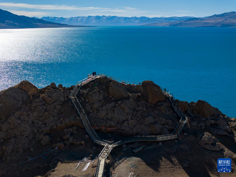 這是當(dāng)惹雍錯(cuò)旁剛剛竣工的棧道和觀景臺(tái)(無人機(jī)照片,12月20日攝)。新華社記者 格桑朗杰 攝
