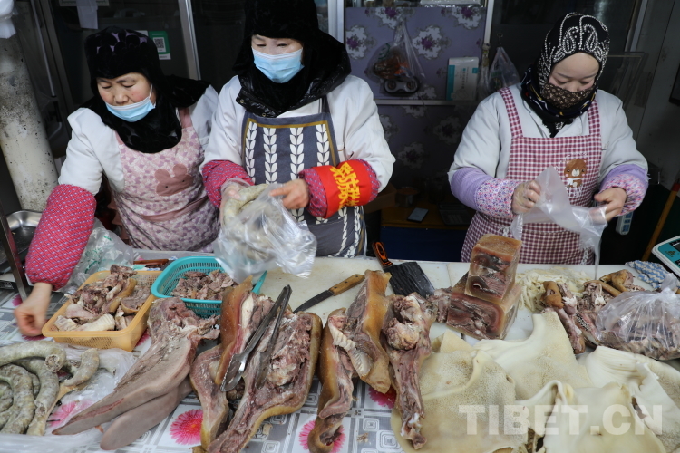 圖為商家在忙碌地賣(mài)牛羊肉 攝影:龍真多吉