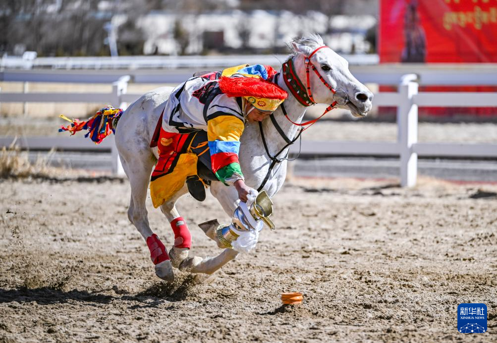 在拉薩賽馬場,騎手表演馬上拾哈達(2月12日攝)。新華社記者 孫非 攝 ??