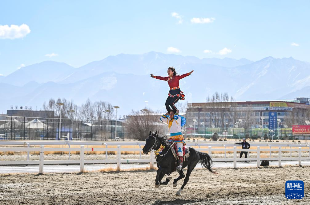 在拉薩賽馬場,騎手進行單馬雙人表演(2月12日攝)。新華社記者 孫瑞博 攝 ??