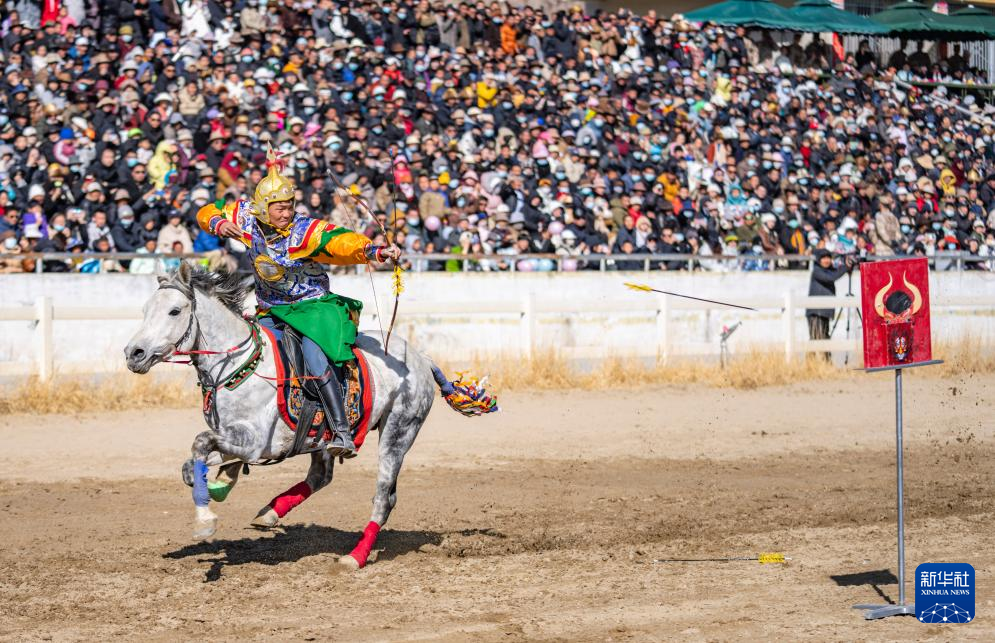 在拉薩賽馬場,騎手表演馬上射箭(2月12日攝)。新華社記者 孫非 攝 ??