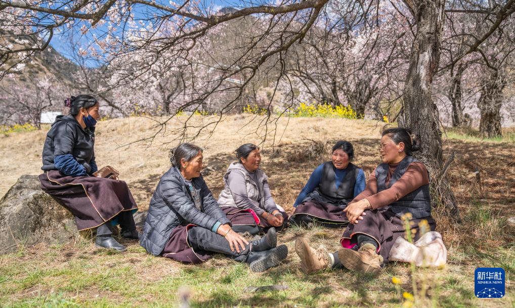 午休時,尼瑪曲吉(右二)與村民在桃樹下聊天(4月1日攝)。新華社記者 丁增尼達 攝