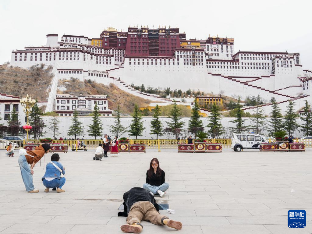 5月5日,游客在布達(dá)拉宮廣場拍照留念。新華社記者 丁汀 攝