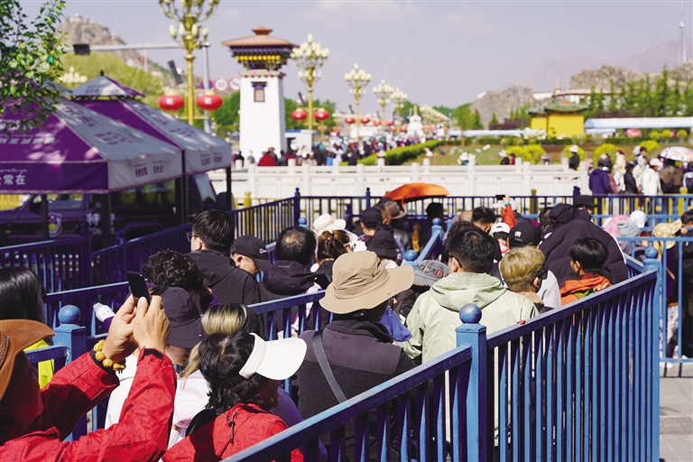 在布達(dá)拉宮廣場(chǎng),地面鋪設(shè)的鏡子成了游客們拍照打卡的絕佳場(chǎng)地。傍晚,來自西安的游客孫女士和朋友興致盎然地等待夜幕降臨,準(zhǔn)備借著華美的燈光和夜景美美拍照?!拔覀冞@次就是來‘特種兵式旅游’的?!睂O女士表示,此次進(jìn)藏7天的行程,她準(zhǔn)備去羊湖、納木措、珠峰大本營(yíng)。因?yàn)楣ぷ髅β?、假期太短,她沒有時(shí)間體驗(yàn)“城市漫游”,只能選擇“特種兵式”游玩?!白蠲赖娘L(fēng)景難道不是在路上嗎?雖然一路很累,但是能看見壯美的風(fēng)光、領(lǐng)略西藏的無限魅力、享受追逐自由的暢快,累一點(diǎn)也無所謂?!睂O女士說道。